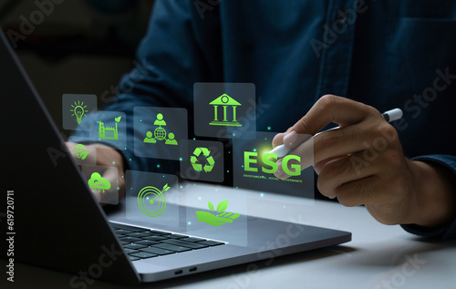 ESG environment social governance investment business concept. Businessmen use laptops to analyze ESG With ESG icons on screen in business investment strategy concepts. Carbon credit. Net zero.