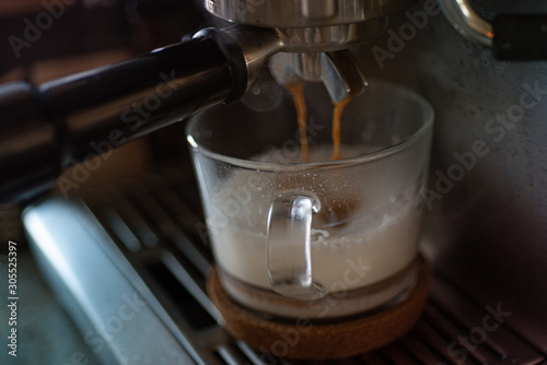 Espresso coffee is flowing out of the coffee maker to glass cappuccino cup with milk foam. Close up view.