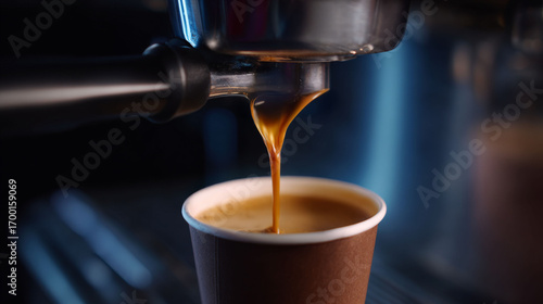 Espresso coffee pouring into brown paper cup, warm beverage with rich crema and smooth texture in cozy setting
