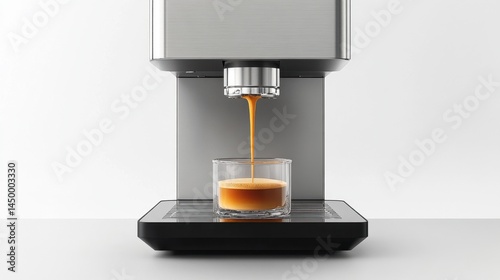 Espresso machine with portafilter locked in, hot coffee flowing into glass cup
