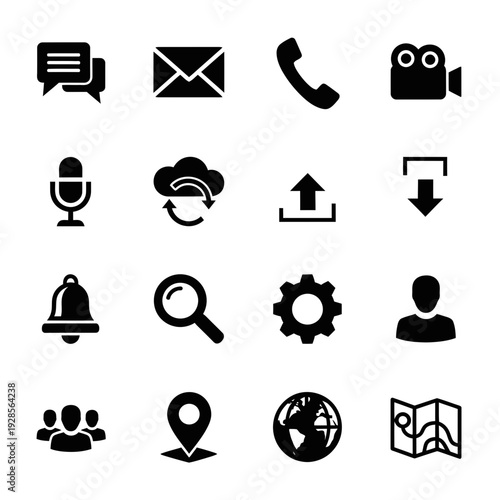 Essential set of black solid communication and technology icons for modern digital interfaces, mobile applications, and web design projects, symbolizing connectivity and user interaction