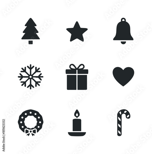 Essential set of festive Christmas and winter holiday icons featuring tree, star, bell, snowflake, gift, heart, wreath, candle, and candy cane perfect for seasonal greetings and decoration