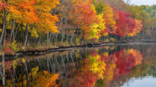 Estuary during a vibrant autumn season, with colorful trees lining the banks reflected in the water.