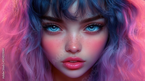 girl, portrait, digital artwork, woman, face, hair, blue, pink, eye, beauty, style, fashion, model, artistic, cute, pretty, aesthetic, fantasy, illustration, art, artwork, creative, colourful, vibrant, neon, glowing, modern, stylish, elegant, dreamy, enchanting, mesmerizing, captivating, intriguing, dazzling, alluring, stunning, radiant, glamourous, gorgeous
