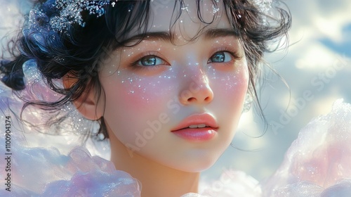 aethereal, beauty, fairy, winter, portrait, woman, girl, face, eye, hair, snowflake, ice, frost, magical, fantasy, dreamy, delicate, soft, gentle, light, glow, sparkle, glistering, pastel, pink, blue, white, elegant, serene, calm, peaceful, artistic, digital artwork, illustration, artwork, graphic, image, photograph, model, pretty, cute, lovely, charming, mysterious, enchanting, whimsical, romantic