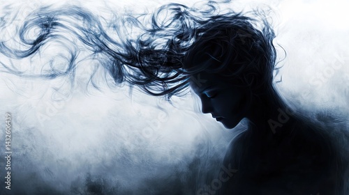 woman, silhouette, smoke, hair, blue, artistic, digital, painting, fantasy, dark, mystery, aethereal, dreamy, melancholy, sorrowful, art, beauty, portrait, image, photo, graphic, abstract, design, texture, whimsical, haze, fog, vapour, cloud, airy, flow, movement, subtile, shadow, light, tone, composition, style, mood, creative, visual