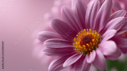 Ethereal Bloom in Pink: A captivating close-up of a radiant, pink chrysanthemum with a vibrant yellow center, set against a soft, blurred background, creating a sense of delicacy and charm.