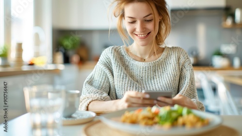 Ethereal Distraction - Composite Image of Woman Texting While Eating at Dining Table, Signifying Digital Addiction
