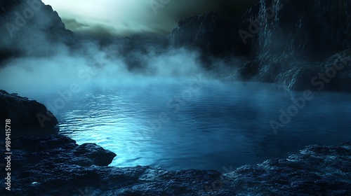 surreal, hot, spring, glowing, water, dark, ambience, misty, surrounding, serene, tranquil, mysterious, mystical, magical, aethereal, landscape, illuminated, relaxing, enchanting, dreamy, peaceful, night, scene, fantasy, reflections, nature, rock, geothermal, steam, eerie, atmosphere