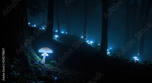 mushroom, forest, night, glowing, mist, nature, aethereal, magical, blue, light, illumination, fungal, tree, landscape, calmness, mystery, beauty, wildlife, outdoors, serene, enchanting, flora, dark, shadow, environment, peaceful, adventure, exploration, fantasy, scenery, vibrant, mystical, botanical, ecosystem, habitat, twilight, luminescence, natural, atmospheric, surreal, tranquil, scenic, wilderness, moonlight, bioluminescence, charme, captivating