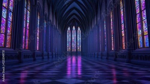 Ethereal Gothic Interior with Colorful Stained Glass Windows