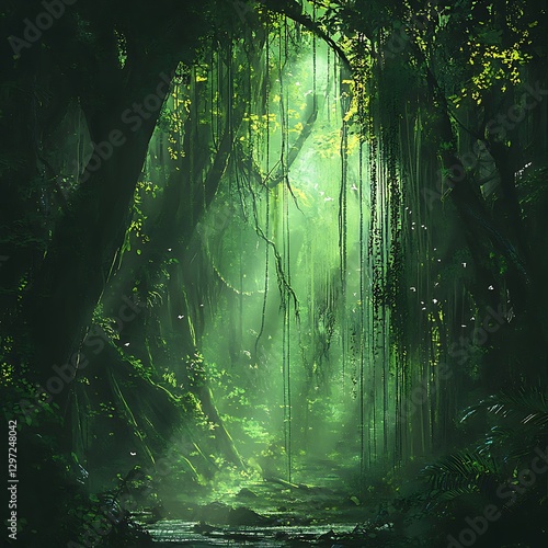 rainforest, forest, jungle, greenery, green, canopy, wilderness, environment, nature, pathway, vegetation, stream, tree, atmospheric, exploration, mystic, vine, fantasy, serene, digital, mysterious, dreamlike, adventure, dense, landscape, peaceful, tranquil, untamed, plant, light, scenic, branch, tropical, enigmatic, lush, artwork, sunlight, aethereal, river, wild, growth, beauty, painting, leaf, water, foliage, shadow, illustration