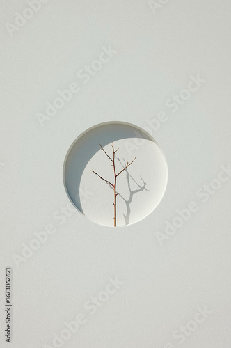 Ethereal Minimalism: A solitary, bare branch casts a striking shadow within a circular opening.