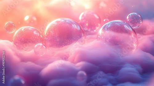 ethereal pink mist swirling in a dreamlike landscape iridescent bubbles floating gently creating a surreal and calming atmosphere