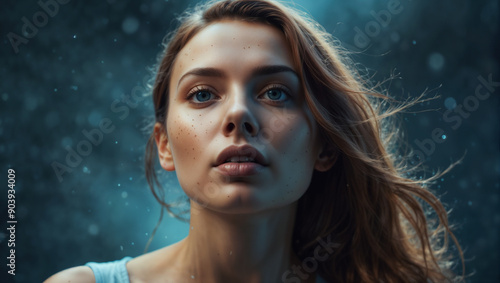 woman, portrait, beauty, closeup, aethereal, magical, fantasy, dream, mysterious, atmospheric, blond, hair, wind, blue, eye, lip, skin, glow, light, particle, snow, winter, cold, night, dark, dramatic, intense, emotional, cinematic, artistic, model, make-up, fashion, youth, feminine, natural, soft, dreamy, serene, alluring, glamour, long, face, look