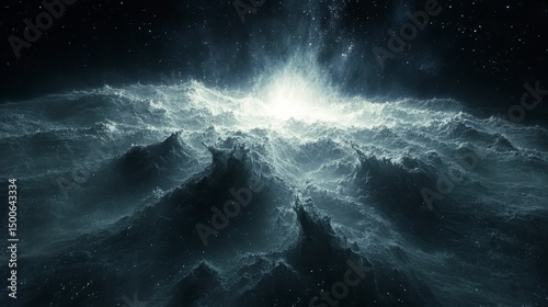 Ethereal scene with a bright central glow over rippling, textured shapes in dark, cloudy space