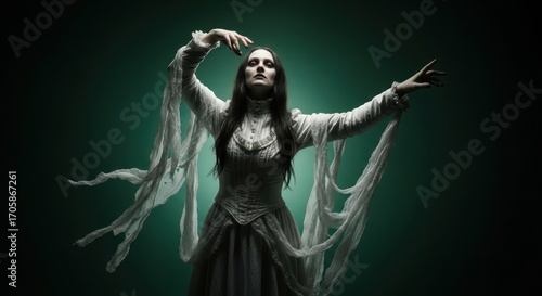 aethereal, woman, dress, flowing, sleeve, green, gothic, fantasy, dark, beauty, portrait, fashion, model, gown, vintage, victorian, elegant, mysterious, graceful, pose, studio, shot, artistic, dramatic, lighting, costume, halloween, cosplay, theatrical, performance, creative, imagination, surreal, dreamy, ghostly, spirit, apparition, supernatural, magical, enchanting, alluring, captivating, mesmerizing, serene, tranquil, peaceful, calm