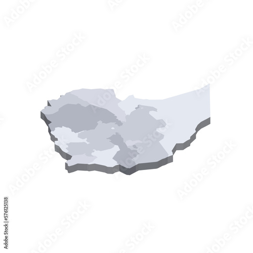 Ethiopia political map of administrative divisions - regions and chartered cities. 3D isometric blank vector map in shades of grey.