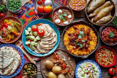 Ethnic food celebration with a vibrant spread of traditional dishes from various cultures, colorful and diverse