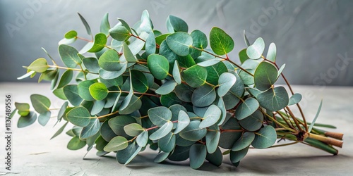 eucalyptus, bouquet, leaf, grey background, floral, photo, image, picture, green, vibrant, realistic, professional, botanical, plant, nature, still life, closeup, macro, detail, texture, light grey, background, photo, artificial intelligence, hi-res, beautiful, elegant, fresh, aromatherapy, high-quality, detailed, studio photography
