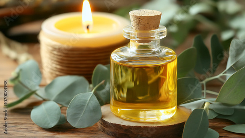 Eucalyptus Leaves, Aroma Candle, and Natural Cosmetic Oil Bottle. Indulge in the healing properties of natural cosmetic oil, aroma candles, and eucalyptus leaves.