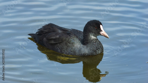 Eurasian coot Fulica atra swimming in pond close-up portrait, selective focus, shallow DOF