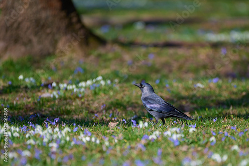 Eurasian jackdaw ,, corvus monedula,, plays in the forest park in sunny day, Danubian wetland, Slovakia