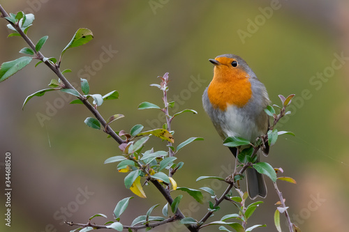 Eurasian robin (Erithacus rubecula) sitting on a branch with nice soft background. Cute songbird with orange throat. Wildlife scene from nature. Czech Republic
