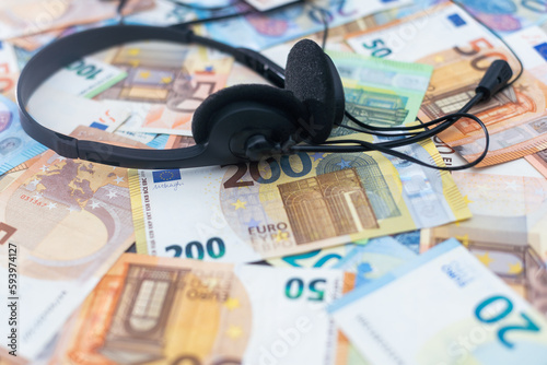 euro banknotes headphones headset. Financial background. Different Euro banknotes. Business, finance, investment, saving and corruption concept.