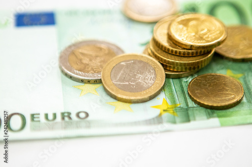 Euro coins on a paper bill