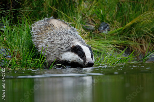 European badger, Meles meles, is going to take bath in forest lake. Badger makes waves as sinks nose in water. Wildlife scene from summer nature. Black and white striped beast. Nocturnal wild beast.
