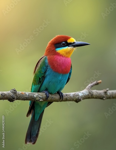 European bee-eater bird perched on branch. Bright, colourful plumage. Beautiful bird, green background. Exotic animal portrait, wildlife photo. Ornithology concept. Focus on feather texture,
