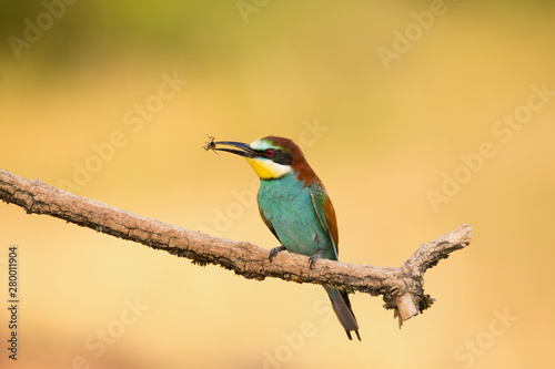 European Bee-eater, Merops apiaster, beautiful bird sitting on the branch with insects in beak.
