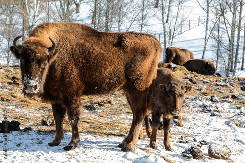 European bison Female with a calf in the winter mountains close-up. Altai, Russia