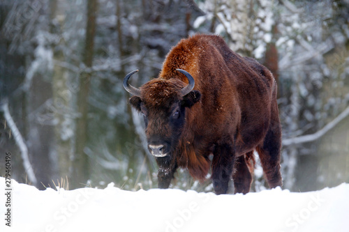 European bison in the winter forest, cold scene with big brown animal in the nature habitat, snow on the trees, Poland. Wildlife scene from nature. Big brown bizon cold witer with snow.