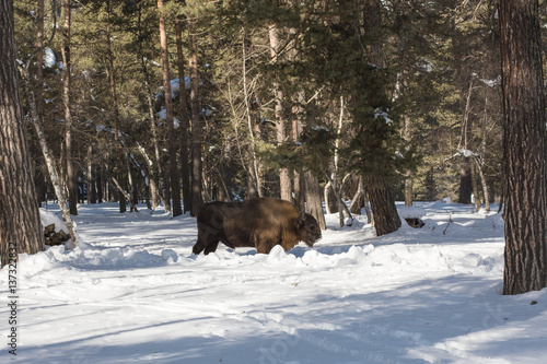 European bison in the winter forest of fir on the background of their natural habitat in the Caucasus Mountains.
