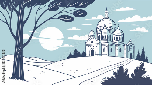 church, basilica, cathedral, building, architecture, dome, tree, sun, cloud, sky, hill, landscape, path, road, bush, plant, nature, historical building, landmark, paris, france, europa, city, exterior, view, scene, horizon, illustration, vector, graphic, flat, art, drawing, line, simple, minimalist, blue, white, grey, peace, calm, serene, tranquil, spiritual, religious, historic, travel
