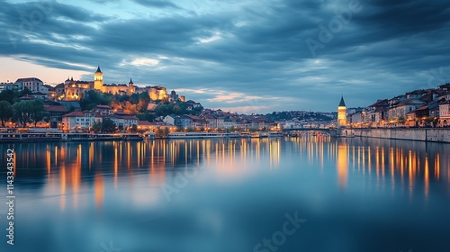 European City at Dusk, River Reflection. Concept of Travel, History, and Beauty.