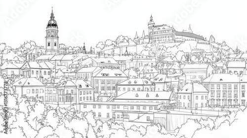 European Cityscape Line Drawing - Detailed line drawing of a European city, featuring a hilltop castle and numerous buildings. Ideal for coloring books or architectural illustrations