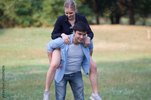 European couples, men and women Showing love to each other in the garden. During the holidays, warm and comfortable holidays in the fields and large trees. Who are planning a marriage