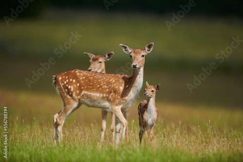 portrait, alert, watchful, fawn, fallow deer, field, outdoors, day, herd, closeup, sunny, detail, standing, eye contact, half face, green background, full-length, selective focus, animal, wildlife, green, cute, vertical, foliage, meadow, color image, blurred background, animal portrait, no people