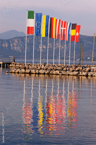 European flags in the port of Cisano on Garda Lake, Verona, Veneto, Italy, Europe