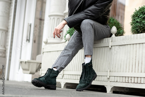 European girl model in gray textile pants, oversize warm leather jacket, green nubuck boots and fashionable hat posing sitting near store