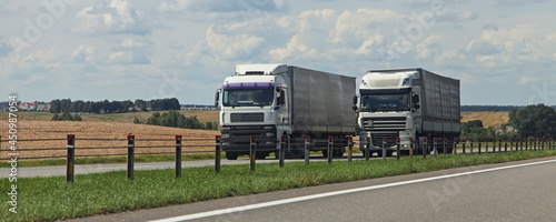 European heavy trucks into oncoming traffic lane on the countryside highway road motion at Sunny autumn day on yellow field and road lane fence background, goods delivery transportation logistics
