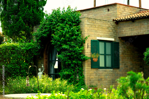 European house in the garden in the morning