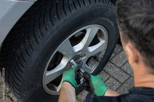 accident, auto, breakdown, car, care, closeup, equipment, european, fix, hand, inflate, maintenance, man, mechanic, person, accurateness, repair, service, specialist, sporty, tighten, tool, wheel, wrench, young