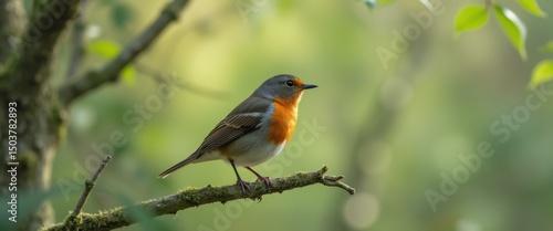 European Robin Perched on Mossy Branch in Forest, Close-Up Bird Portrait