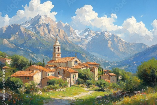 European Town Landscape with Cathedral Mountains Summer Afternoon