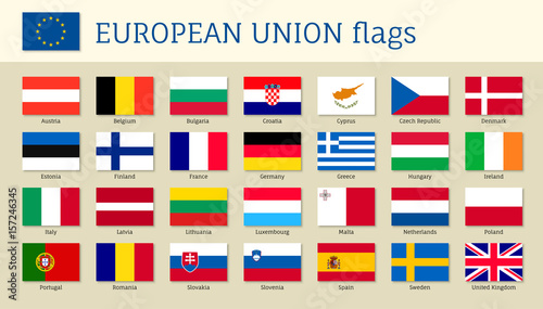 European union big set flags, twenty eight, 28 EU member countries, political and economic union in 2017, single market and free movement. Vector flat style illustration