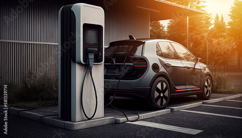 EV Car or Electric vehicle at charging station with the power cable pump supply plugged, car fueling station connected power, alternative sustainable eco energy, Generative AI
